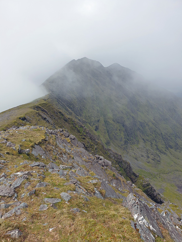 Belle et longue rando, malgré un brouillard tenace, le "fer à cheval" du Carrauntoo Hill, pour découvrir les arêtes du plus haut sommet d'Irlande ou comment faire 1290m de dénivelé, sur une montagne de 1049m d'altitude ?