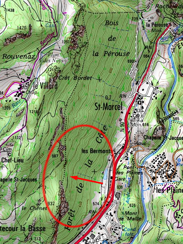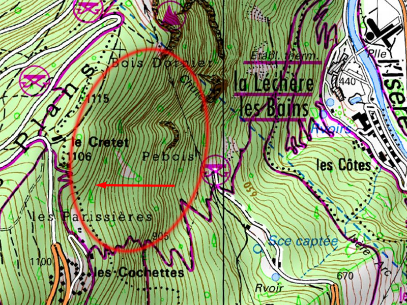 localisation - Saint Oyen, Le Crêtet - alt 1030m, orientation ESE - coordonnées GPS approx. : ? - épicéa ? - aire localisée mais non trouvée |