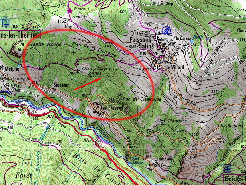 | localisation - Feissons sur Salins, ravins de Champ Magny - alt. 900-950m, orientation SW - coordonnées GPS approx. : ? , probablement ravin de Champ-Magny - aire non localisée |