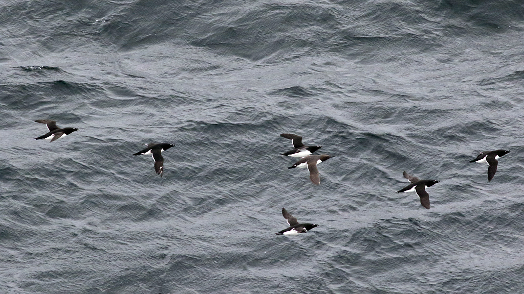 5 Guillemots de Troïl et 2 Pingouins torda, sur l'eau