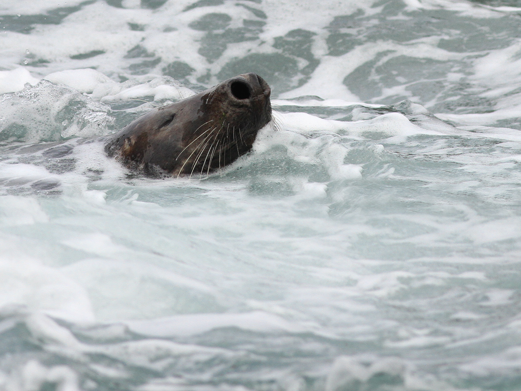 | identification : | tête plate / museau allongé, dans la continuité de la tête = pas de décrochement au niveau du front / narines plutôt parallèles, rondes quand elles ont ouvertes / pelage gris avec des grosses taches (pelage foncé et taches claires = mâle, pelage clair et taches foncées = femelle) |