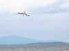 Morus bassanusFou de Bassan adulte en vol, avec algues
