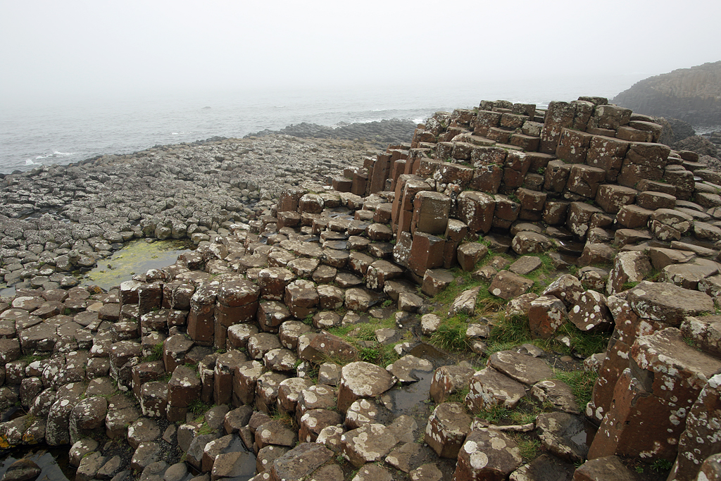 Il pleut toujours mais nous gagnons la Chaussée des Géants et, à la faveur d'une relative accalmie, nous pouvons profiter des étonnantes colonnes de basalte.
