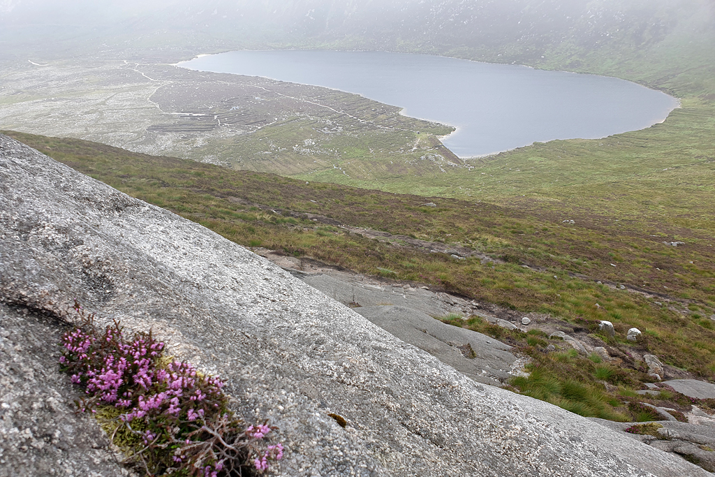 Retour à la nature... et au brouillard, dans les Mourne Mountains. Lieve Doan est un sommet central d'où la vue sur les montagnes et les lacs voisins est réputée. Mais le plafond est bas et nous verrons surtout beaucoup de tourbe, de granit et de bruyère, l'ambiance est magnifique quand même !